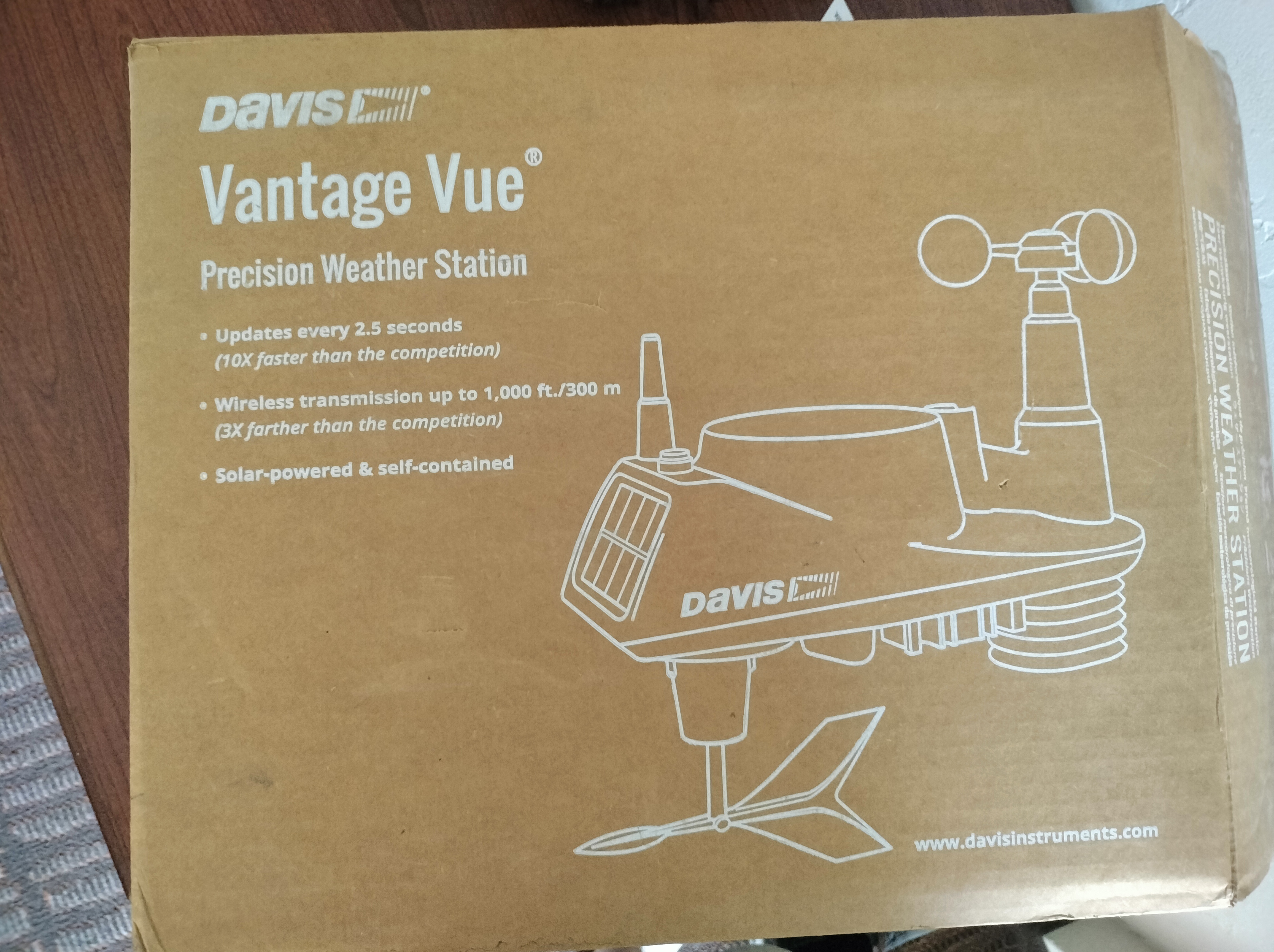 Great news! Brian was able to score a new in the box Davis weather station off FB Marketpace! Now we need to learn how to power it via solar and connect it to the web. That effort is in motion but it may take a while for the system to be on line. Will keep you posted. Good job Brian!